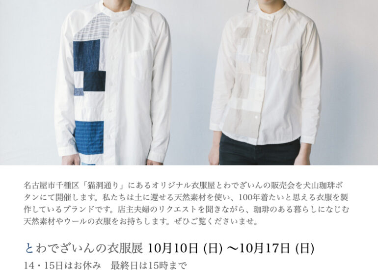 猫洞から犬山へ参ります。 いつもとわでざいんの衣服を私服やお店のユニフォームとしてもご愛用いただいている【珈琲ボタン】さんに今年も伺います。 店主夫婦のリクエス...